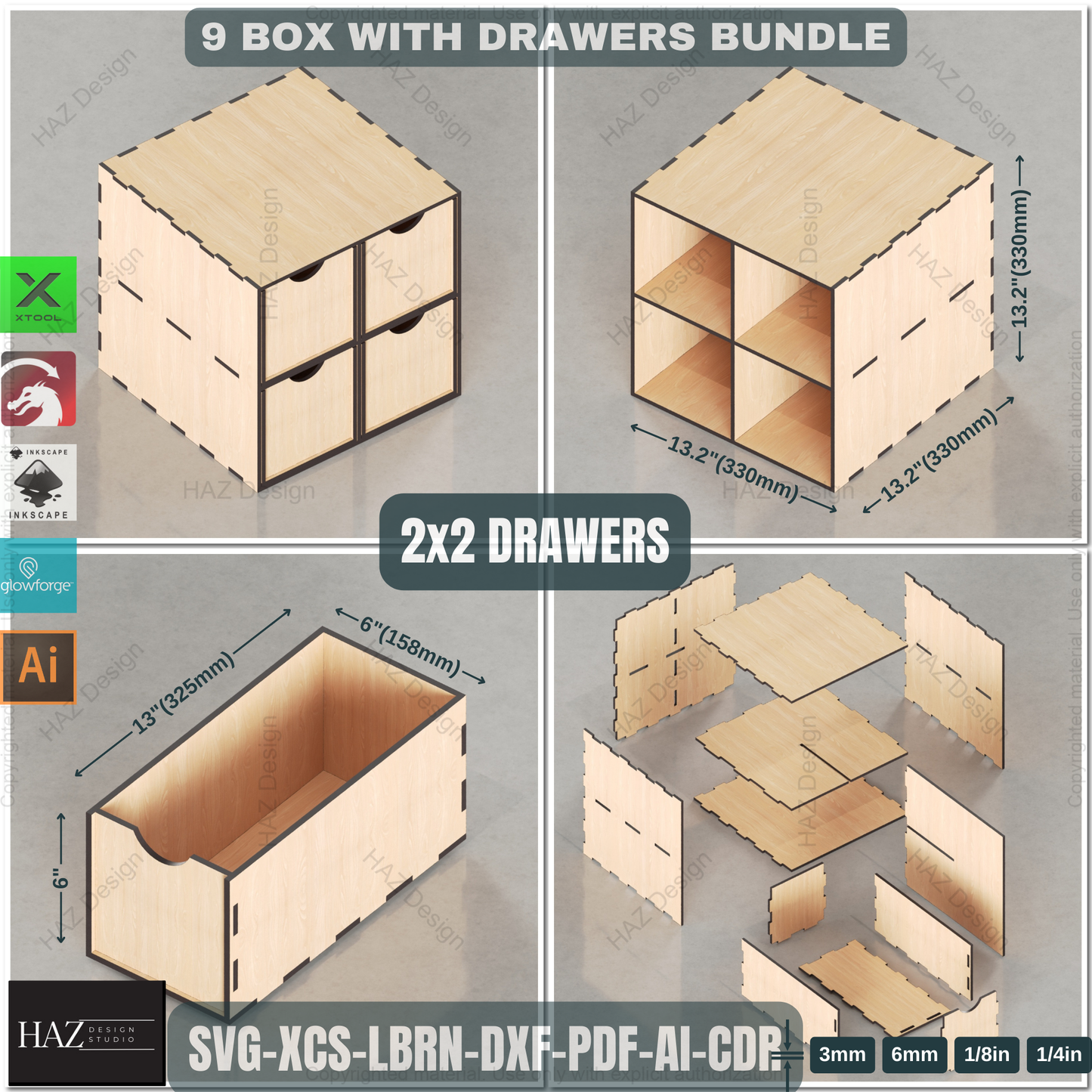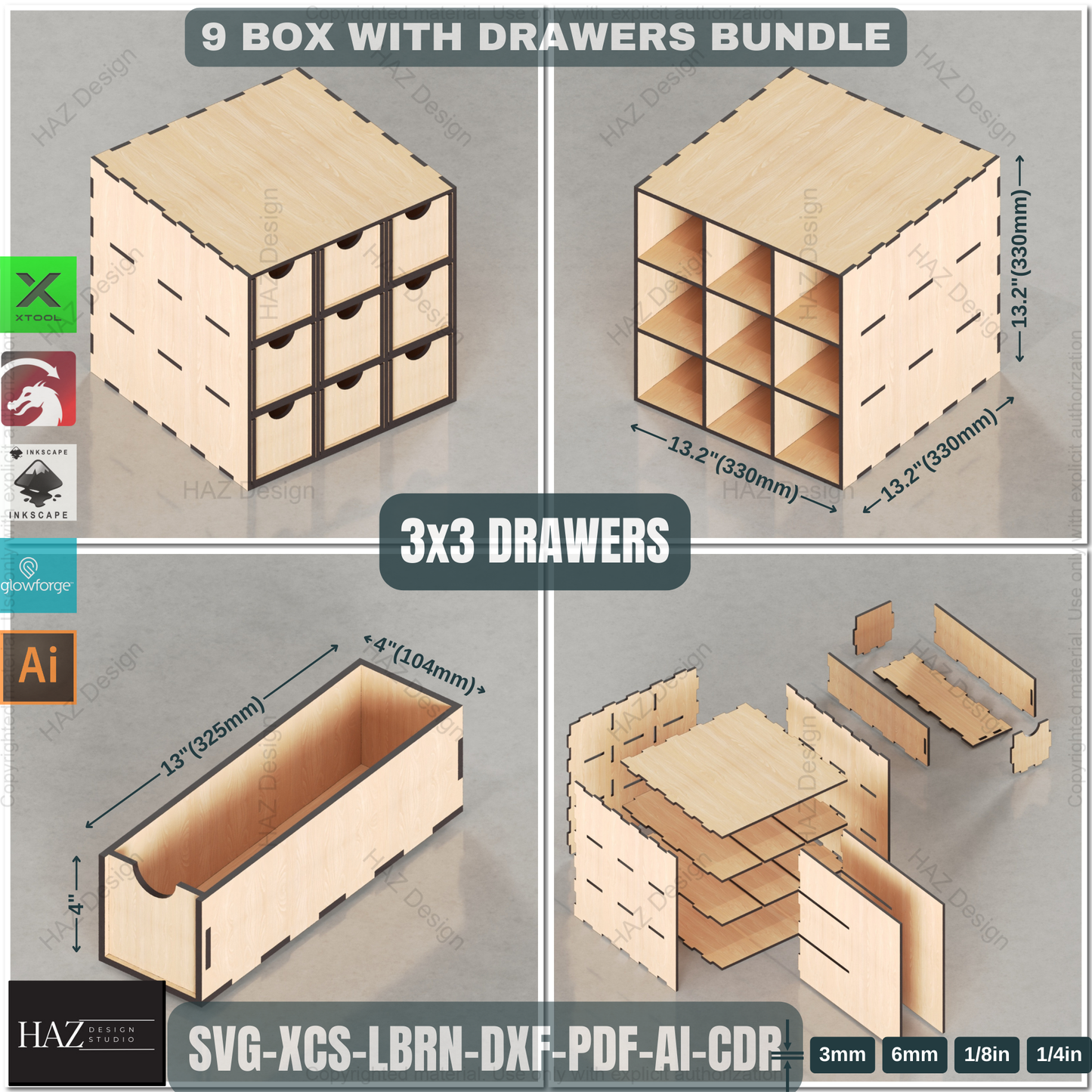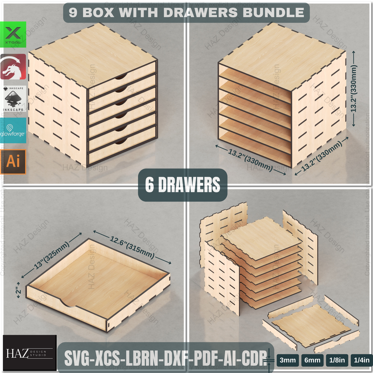 Dive into the world of custom organization with this incredible value bundle featuring 9 distinct and versatile laser cut designs for stackable, modular drawer boxes. Whether you're aiming to tame the chaos in your craft room, bring order to your workshop, streamline your office, or simply add stylish, functional storage to your home, this bundle provides the digital blueprints you need to create the perfect solution.