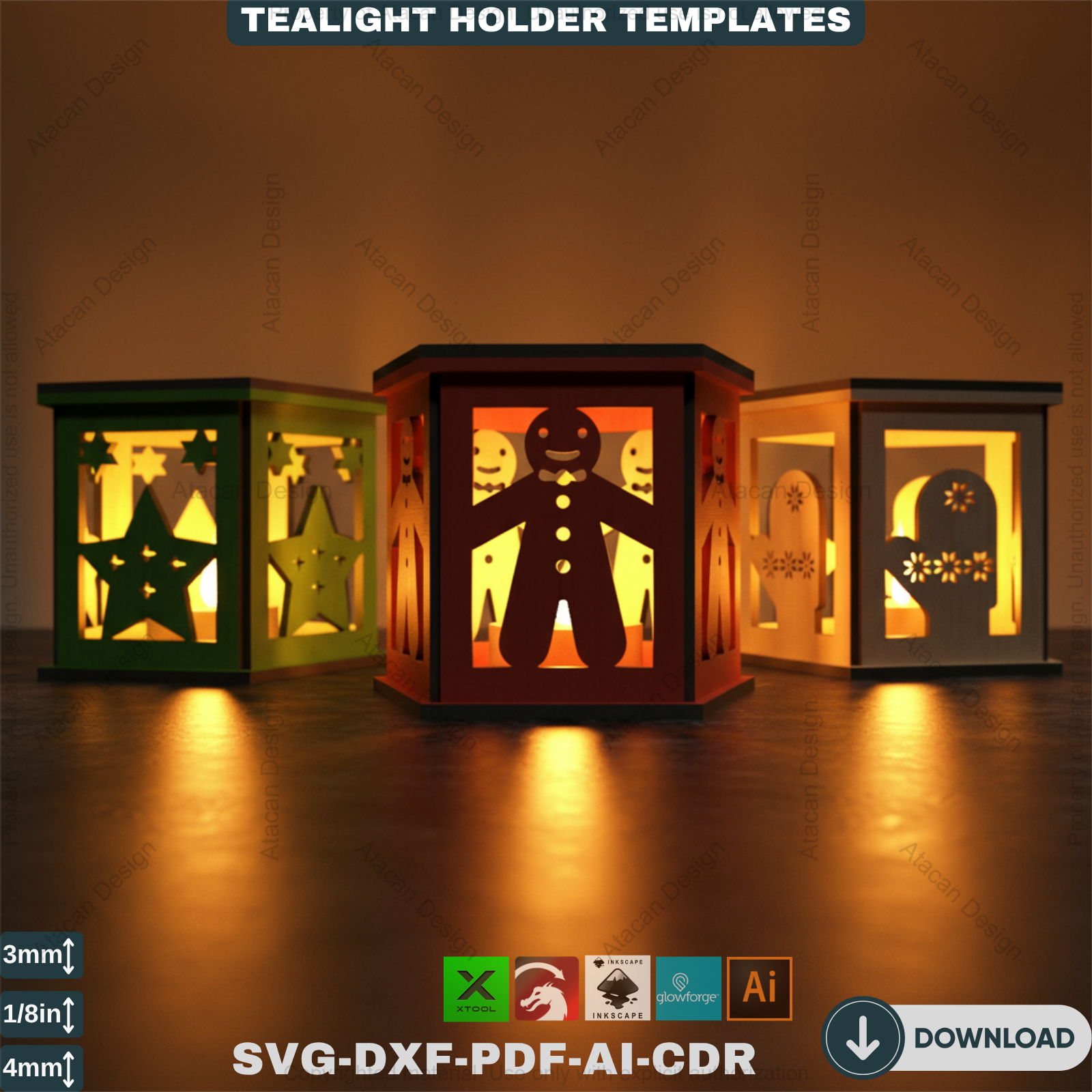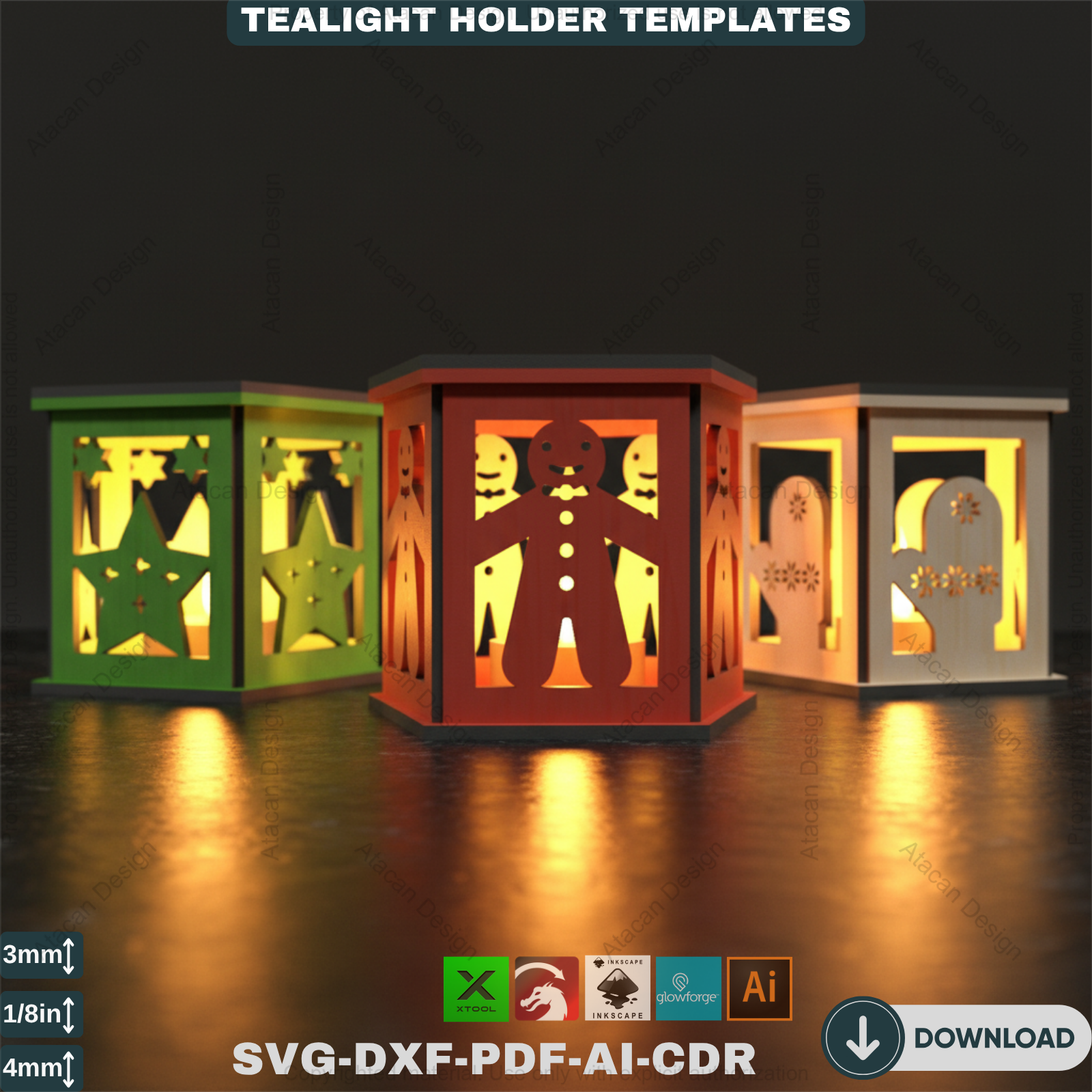 Bring cozy holiday charm to life with this enchanting laser-cut Christmas Candle Holder! Perfect for crafters and small businesses, this versatile design features delightful gingerbread, snowman, and sleigh motifs – ready to transform into a stunning tealight lantern, night light, or festive centerpiece.