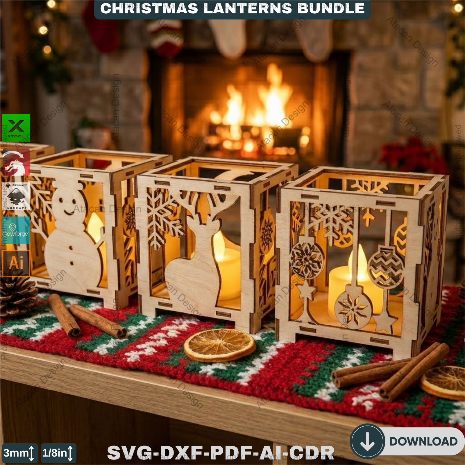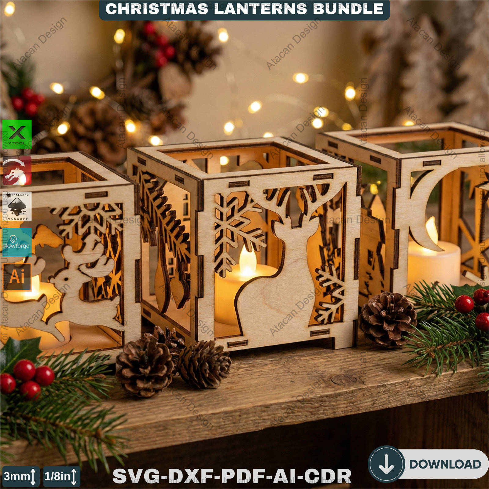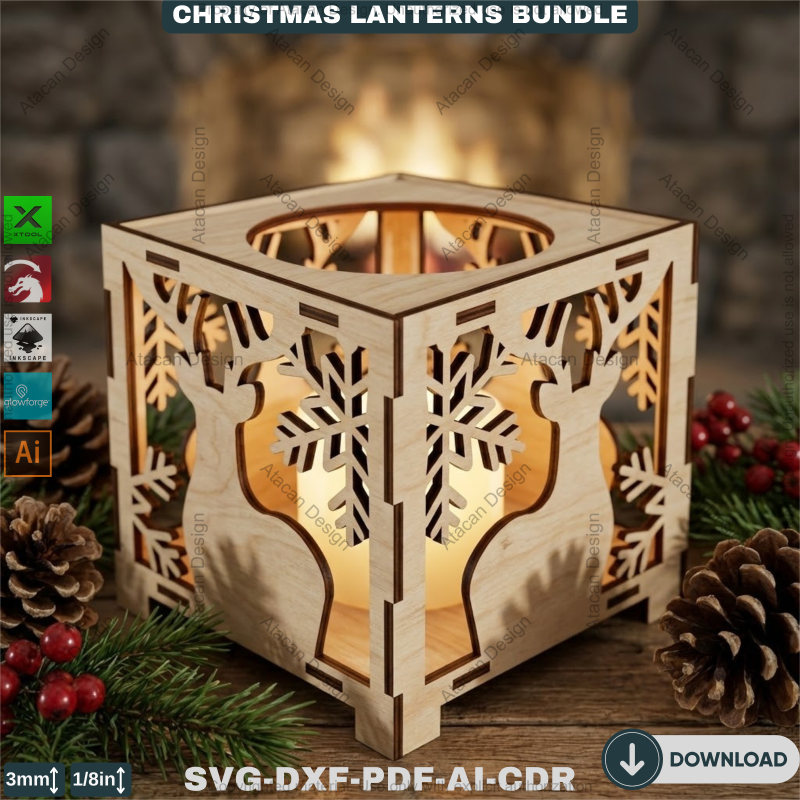 Christmas Lantern Laser Cut Bundle, Wooden Tealight Holder, Xmas Candle Box, Winter Decor, Reindeer Snowman Template 927