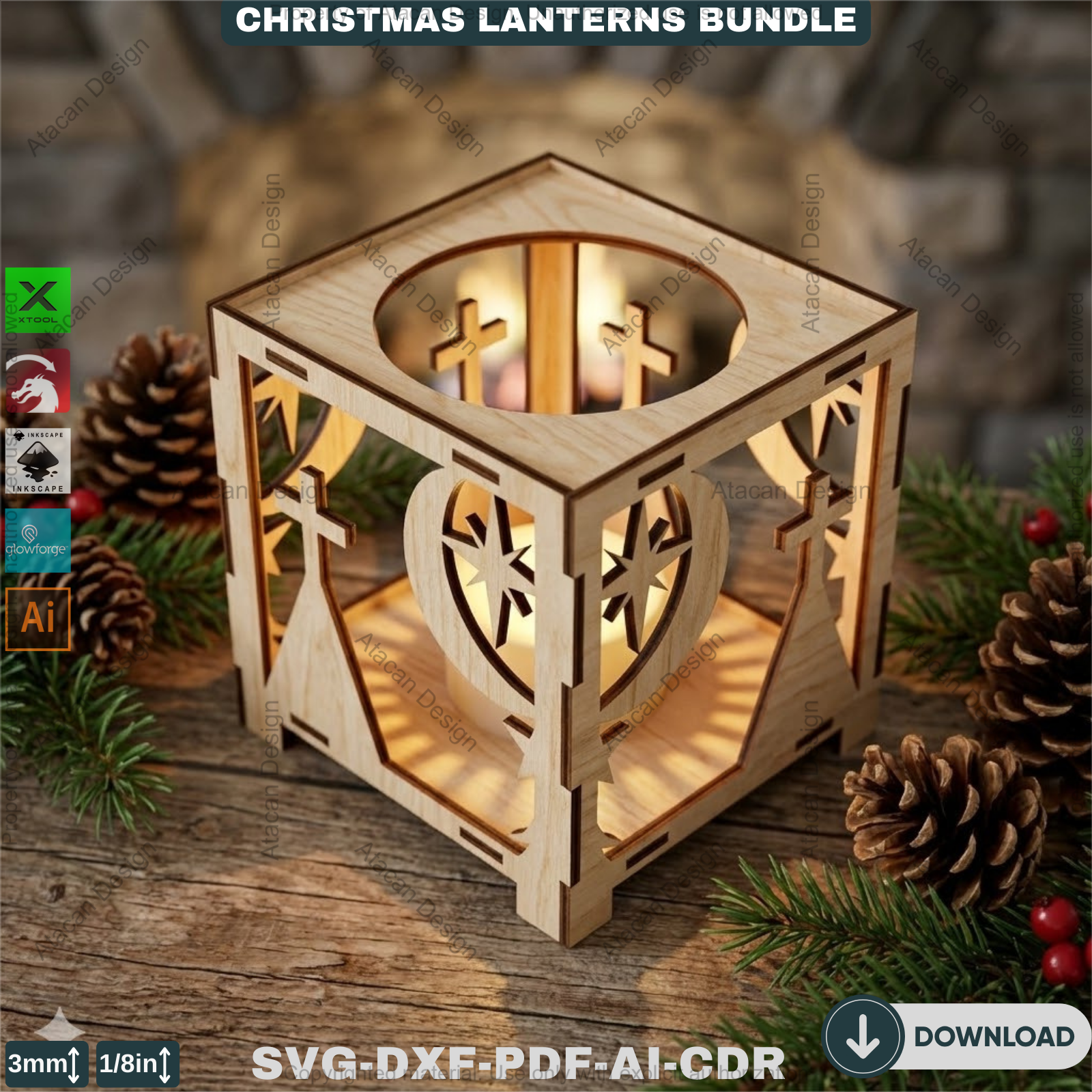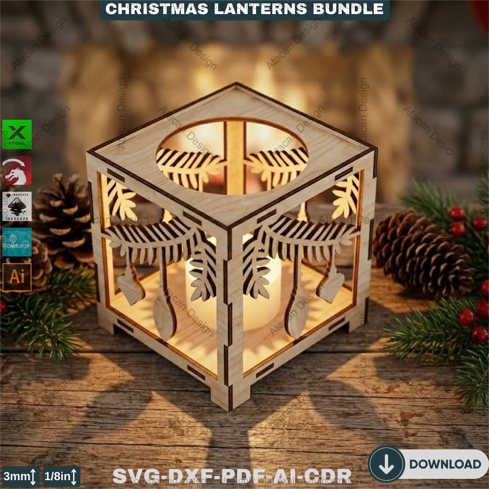 This is a digital download containing high-quality vector files suitable for a wide range of laser cutting machines. The bundle includes designs for multiple unique lantern styles.