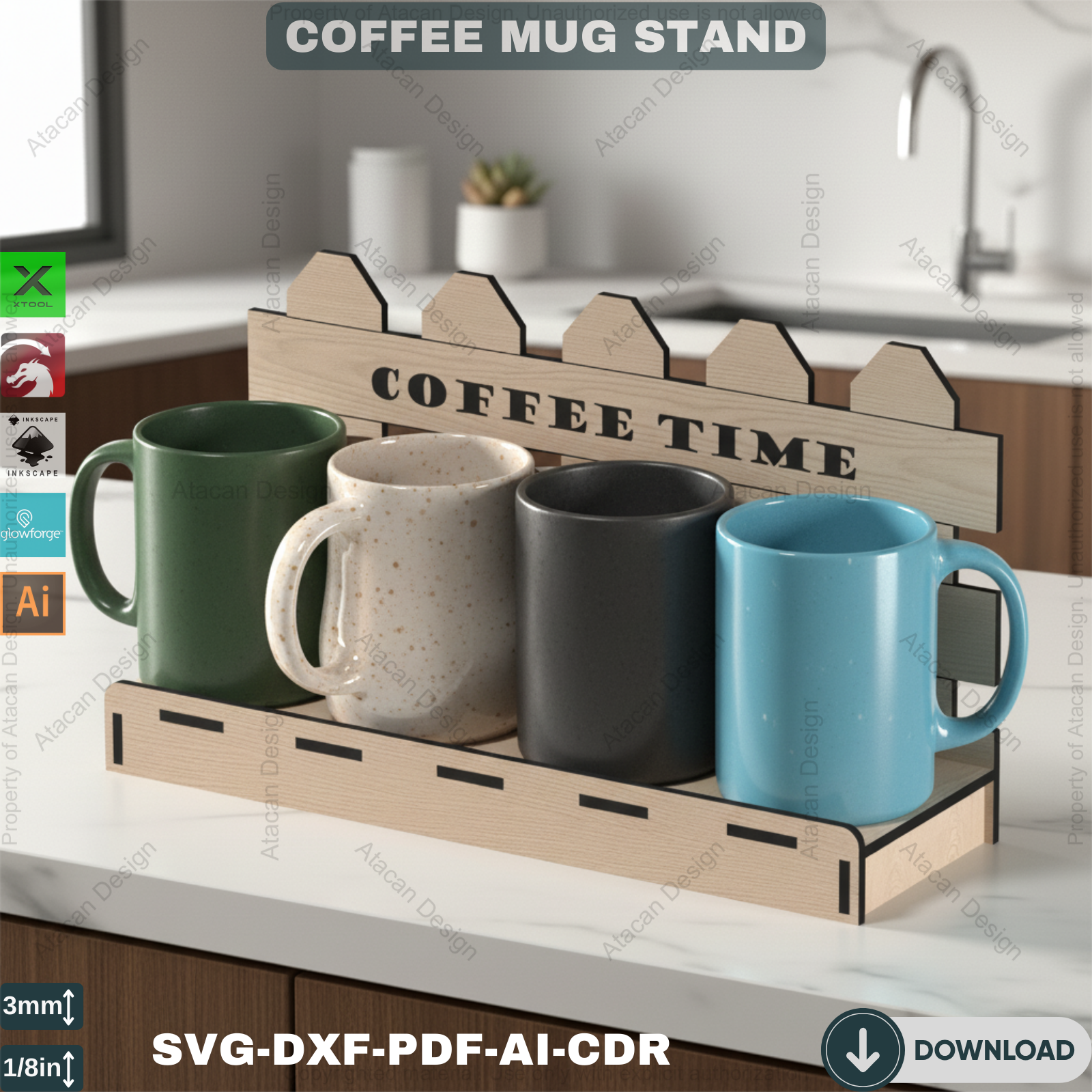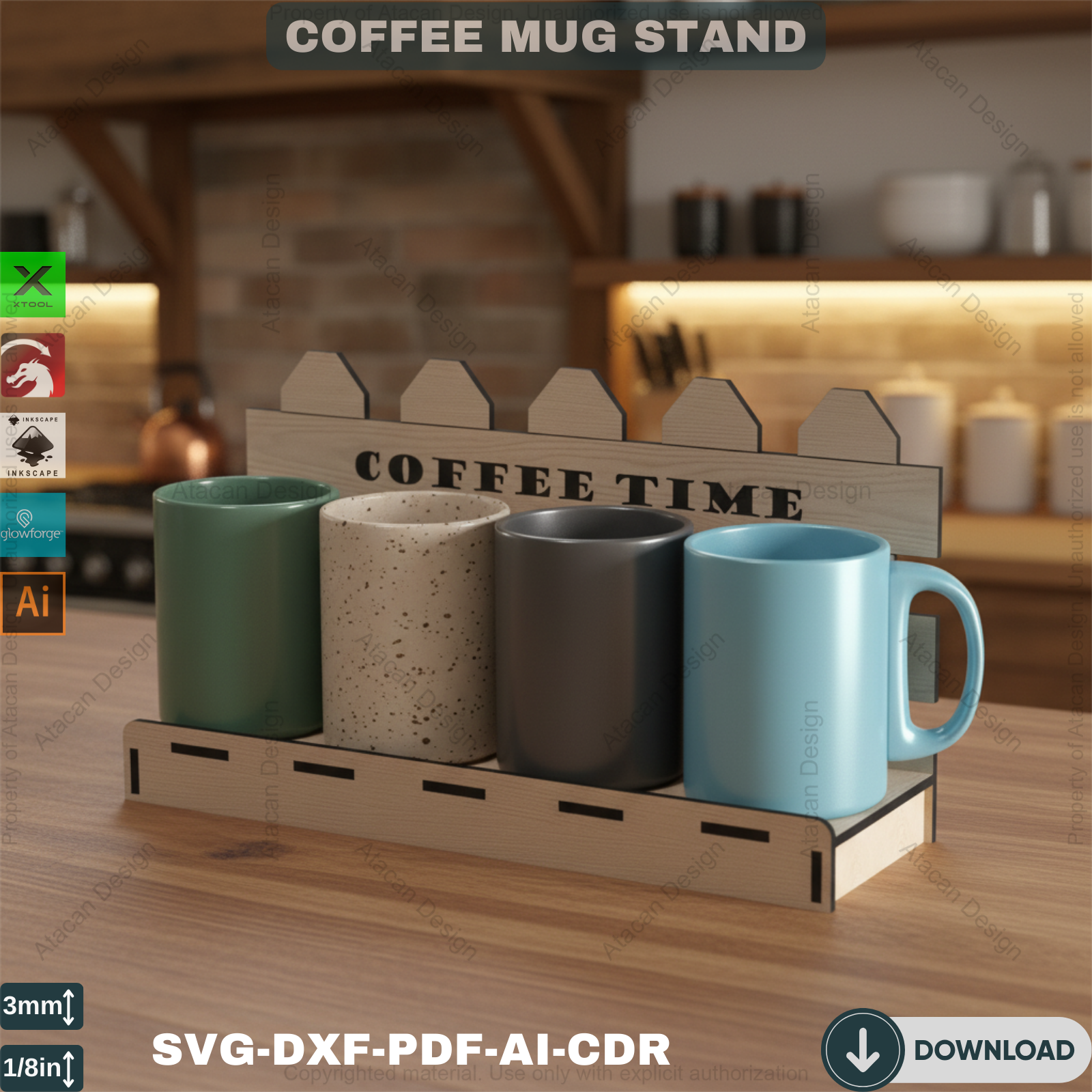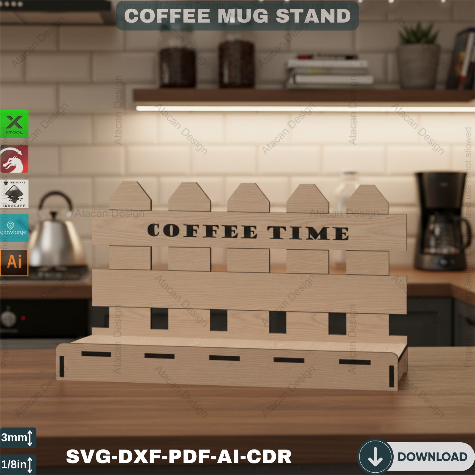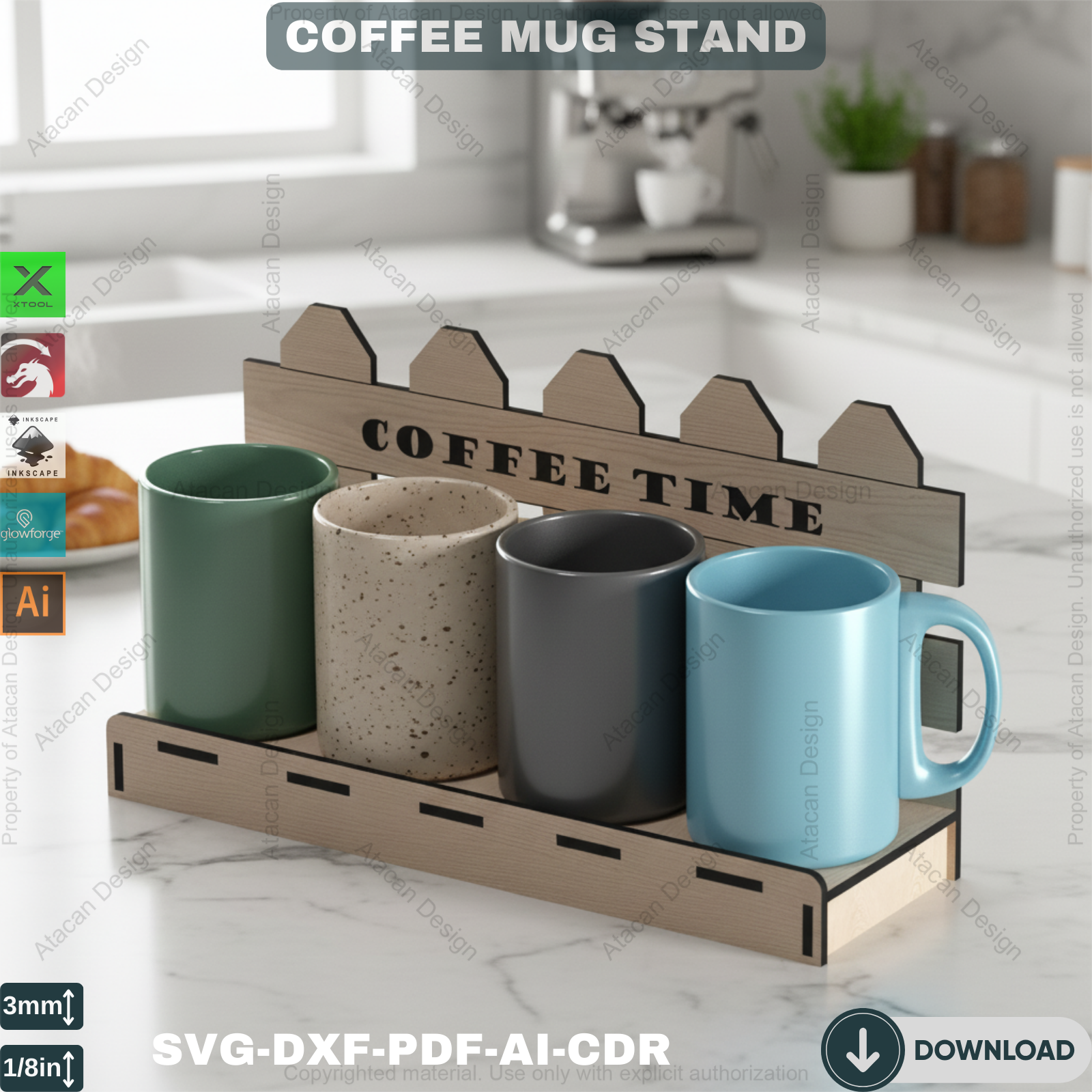Compatibility: Our Coffee Mug Display Stand files are compatible with popular laser cutting machines such as Glowforge, Xtool, Omtech, Gweike, and many more. You can effortlessly use these files to create a precise and beautiful coffee mug holder.