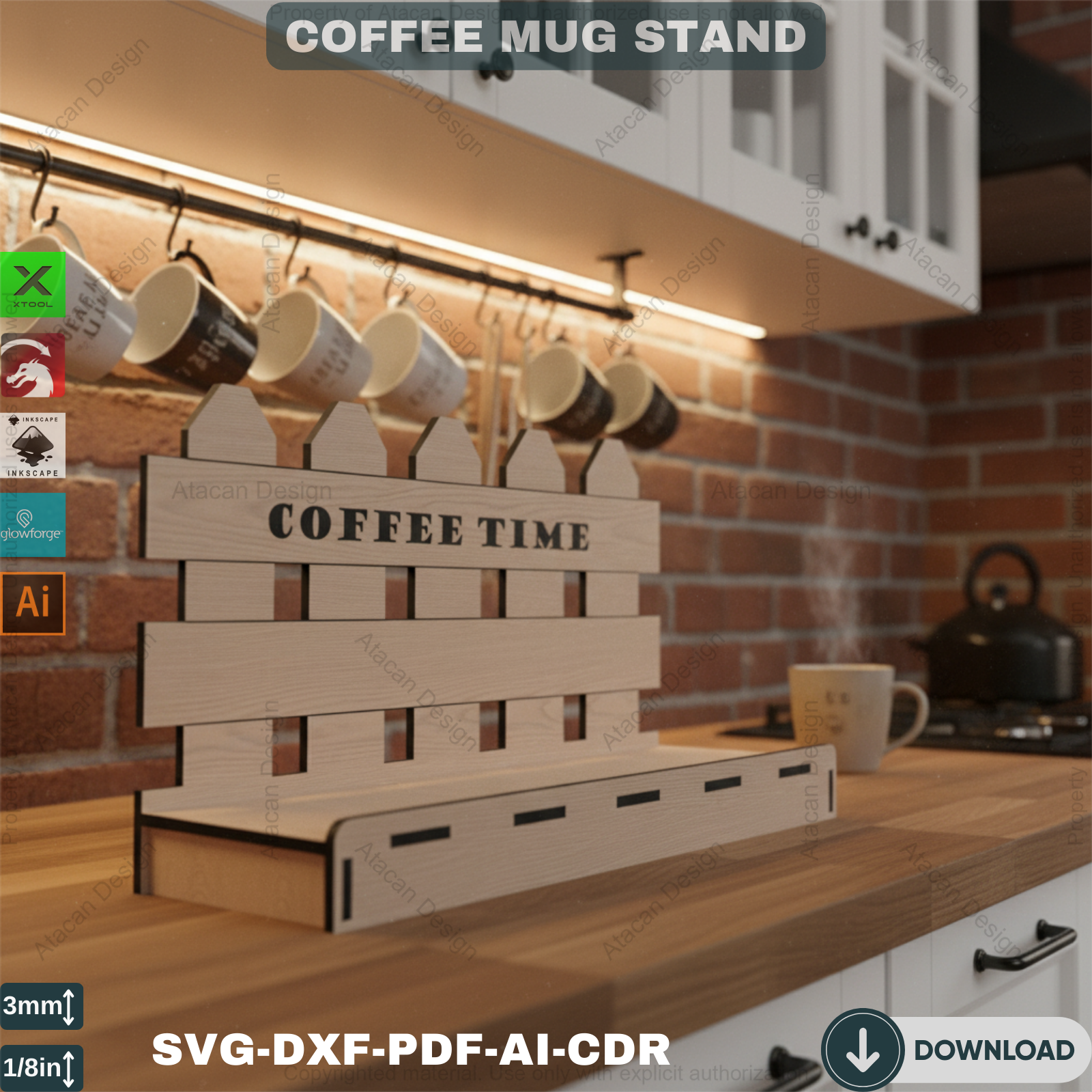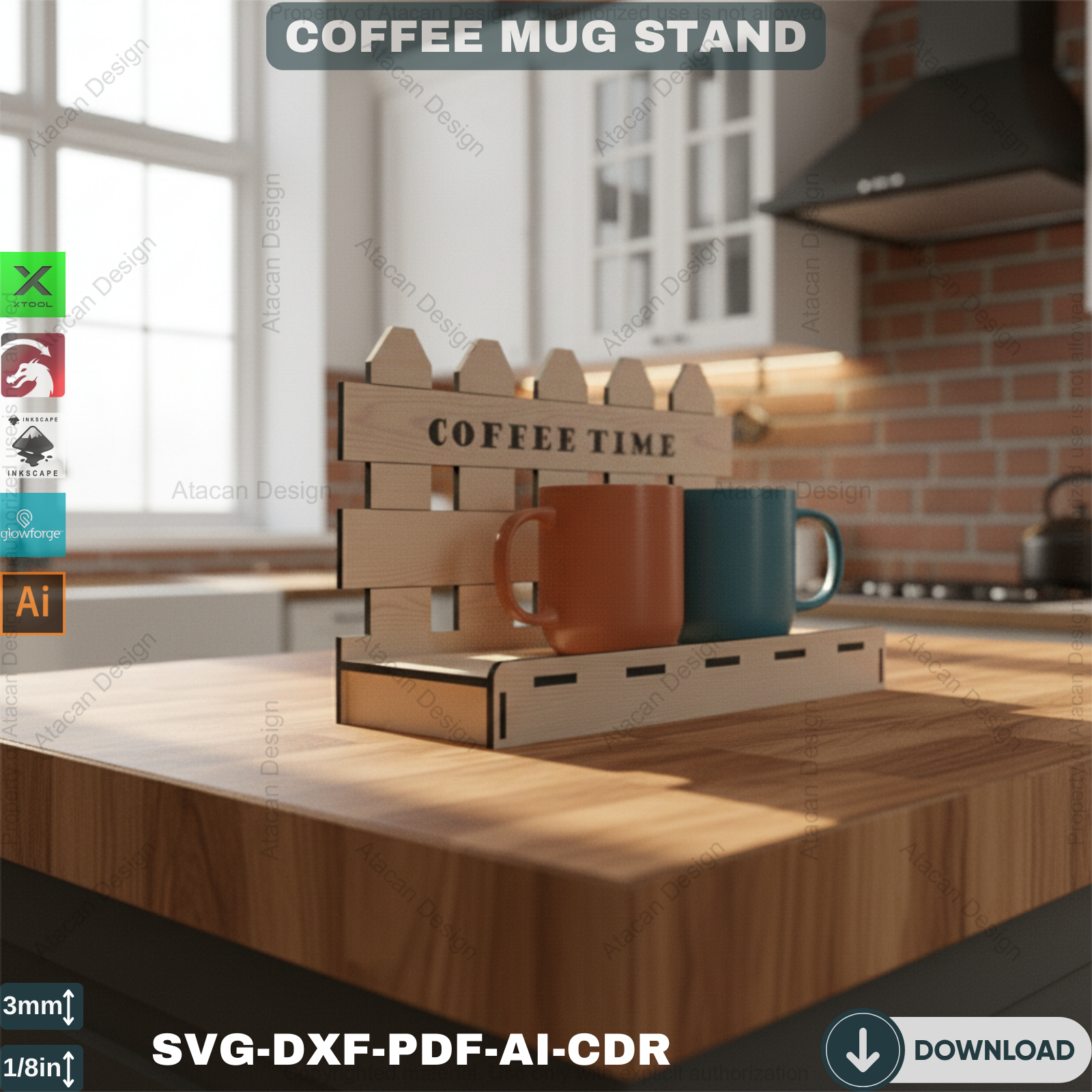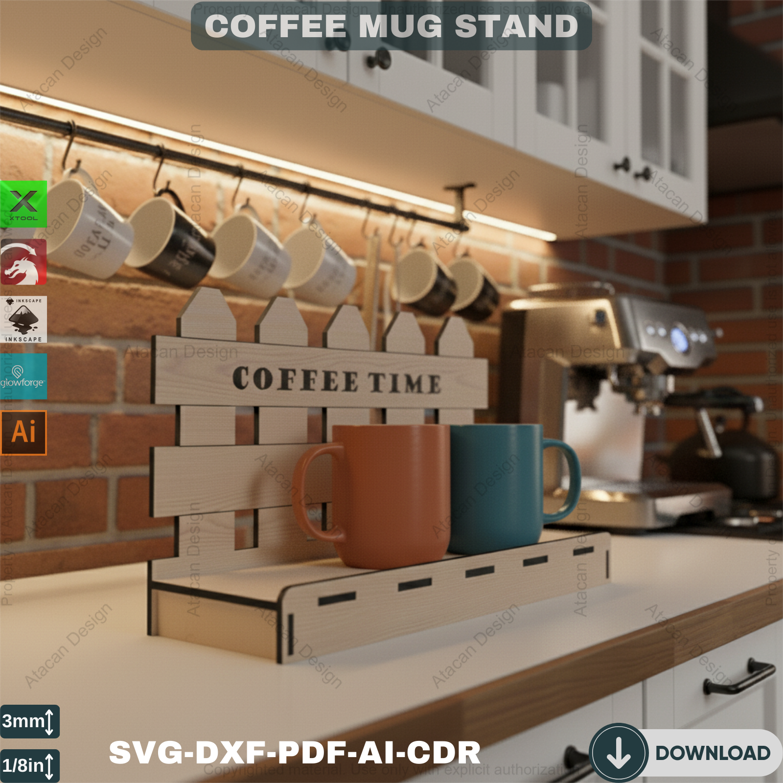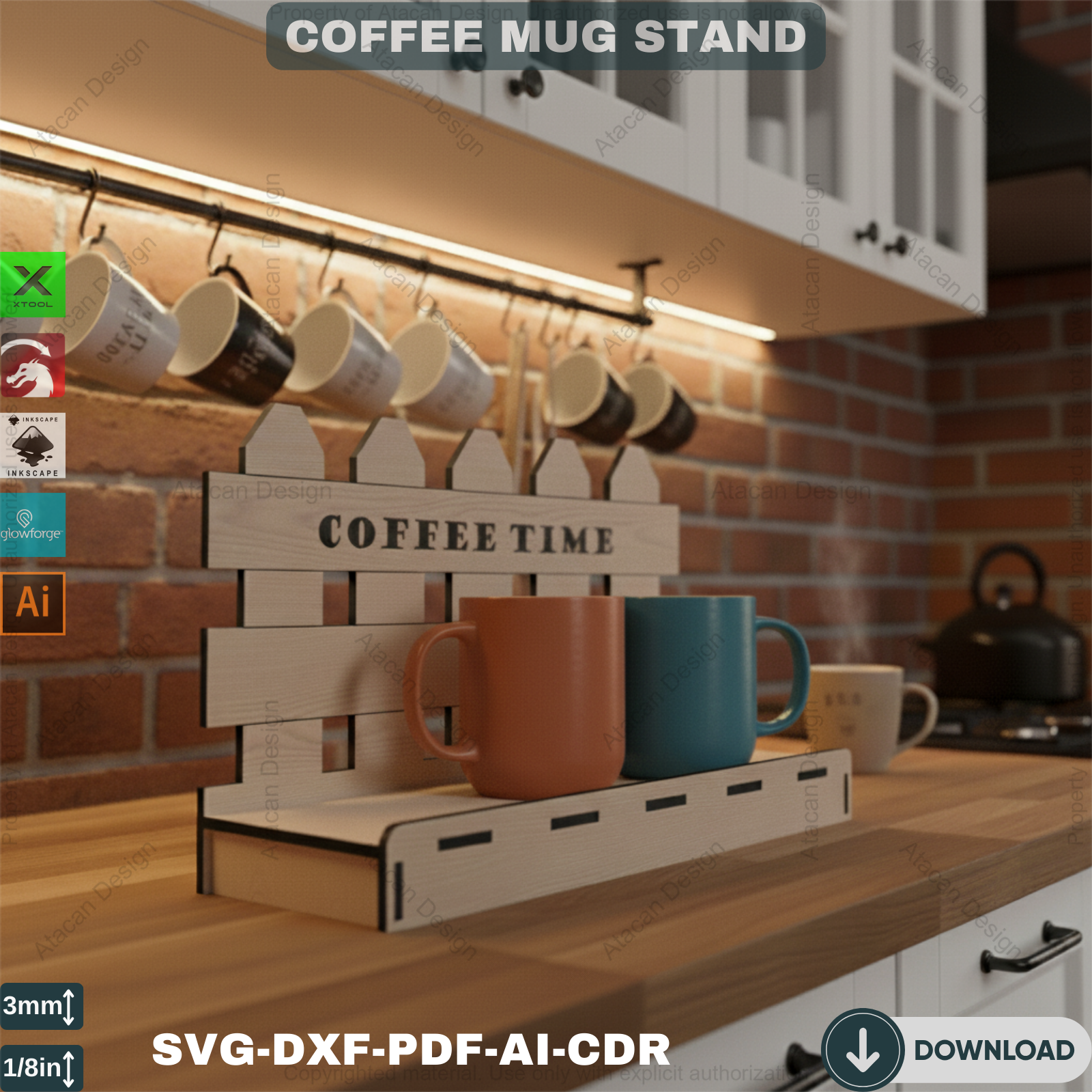 Compatibility: Our Coffee Mug Display Stand files are compatible with popular laser cutting machines such as Glowforge, Xtool, Omtech, Gweike, and many more. You can effortlessly use these files to create a precise and beautiful coffee mug holder.