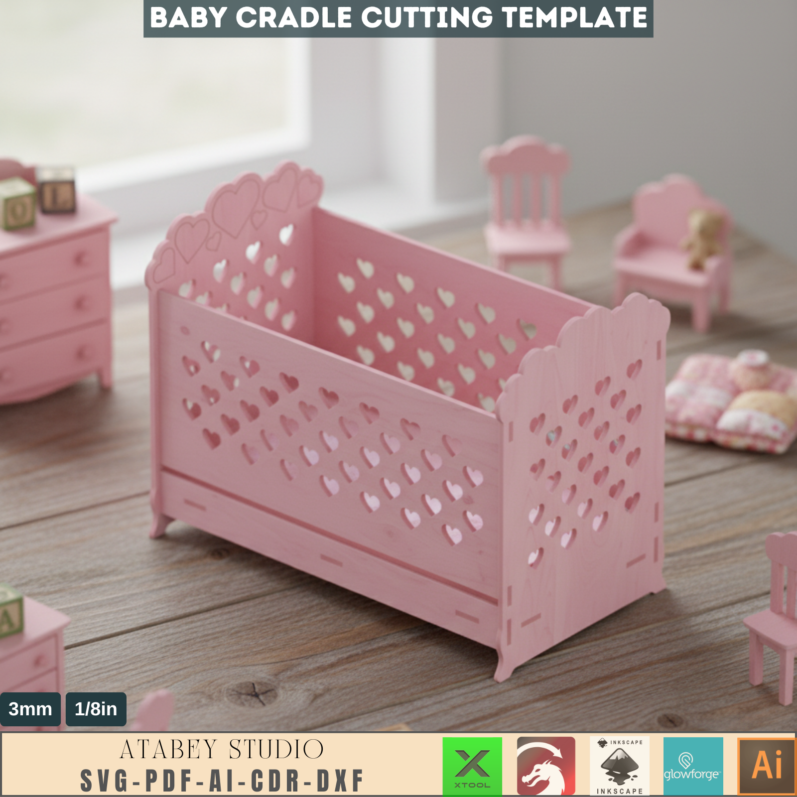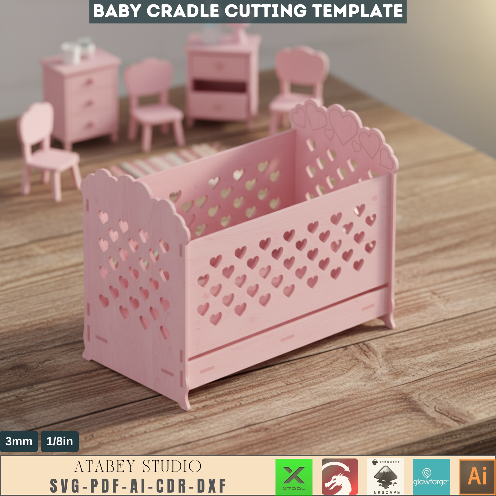 Bring love and warmth to your nursery with our DIY Wooden Cradle Design, featuring an enchanting heart pattern. These ready-to-use laser cut files are provided in SVG, AI, DXF, CDR, and PDF formats for your convenience. Ideal for the woodworking enthusiast or the crafty parent-to-be, this design is not only aesthetically pleasing but also promotes a safe and comfortable environment for your baby. With easy assembly and customizable options, create a cherished piece that your family will love for years to come.
