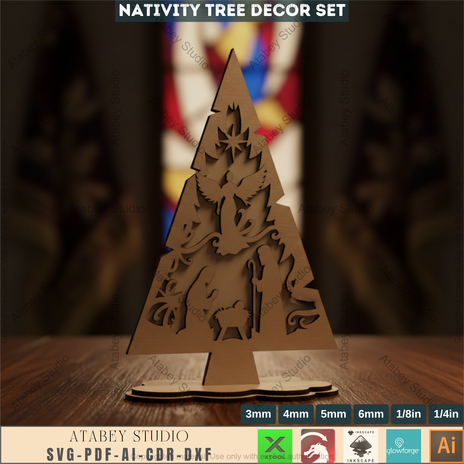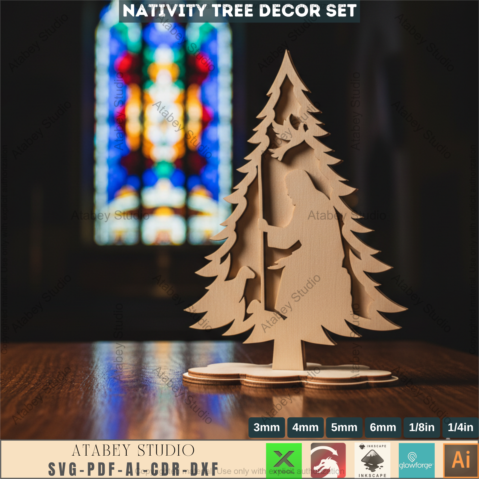 Laser Cut Nativity Tree Decor Set, 3D Standing Faith Christmas Ornaments, Wooden Tabletop Cross Tree SVG 966