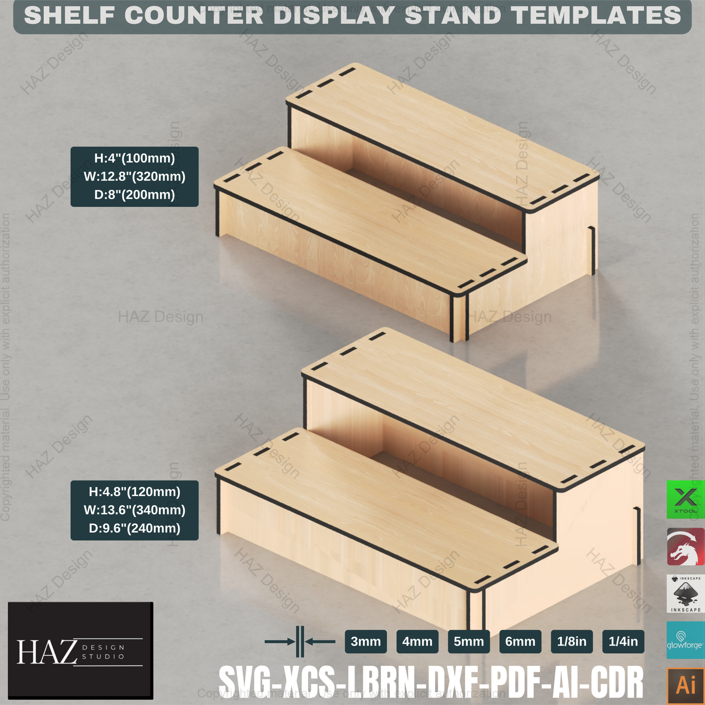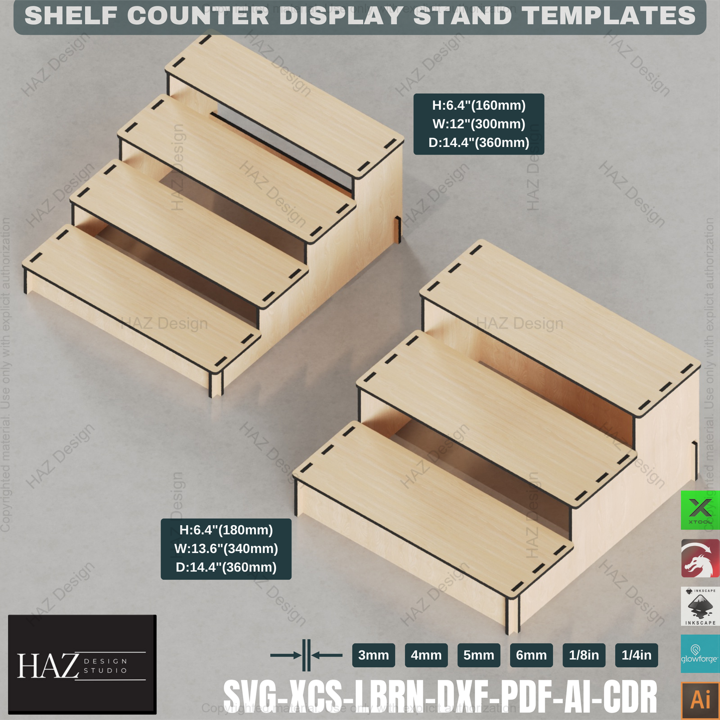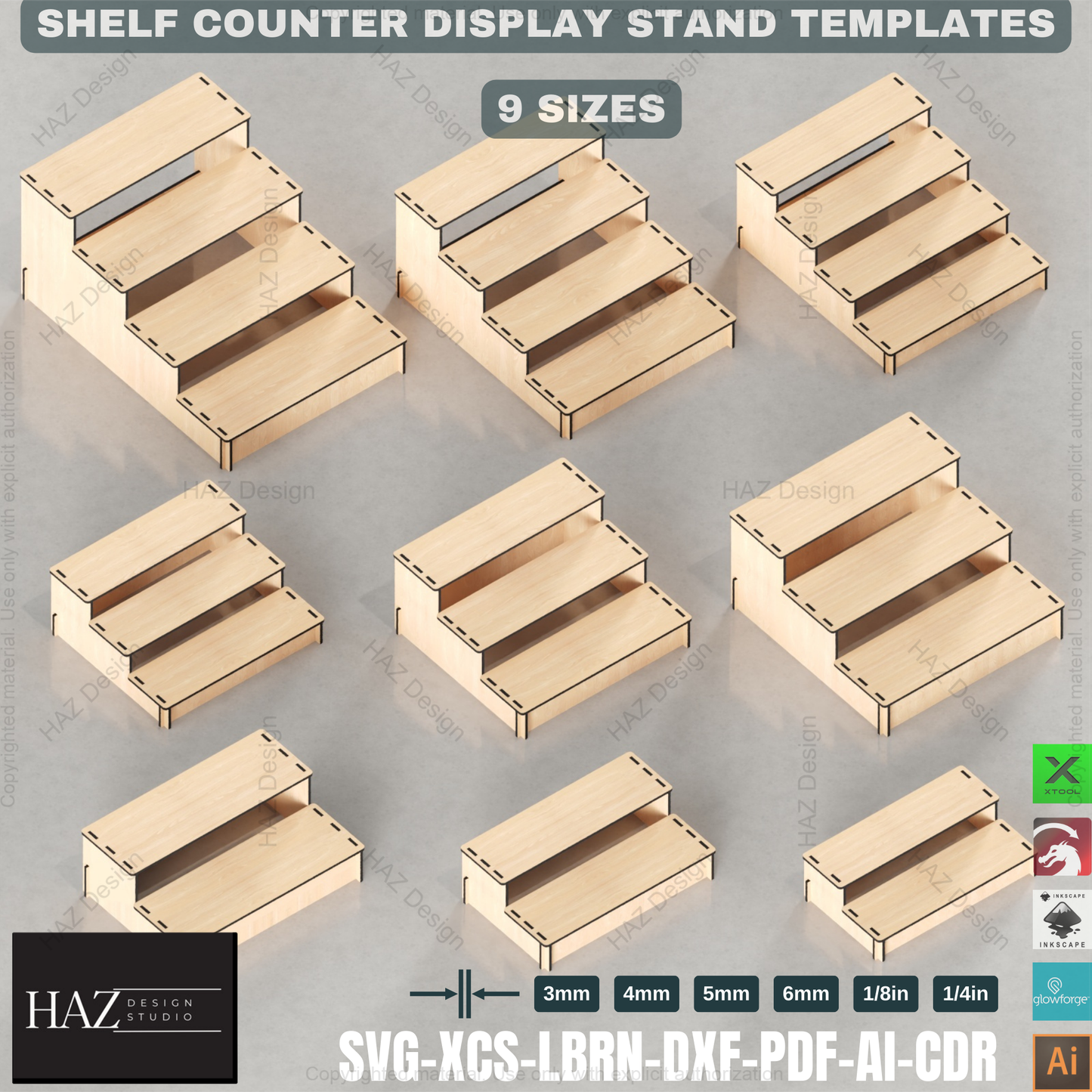 Elevate your product displays with our versatile Shelf Counter Display Stand Templates! This digital download provides everything you need to create professional-looking, tiered display stands using your laser cutting machine. Perfect for craft fairs, retail environments, market stalls, or even organizing your own workspace.