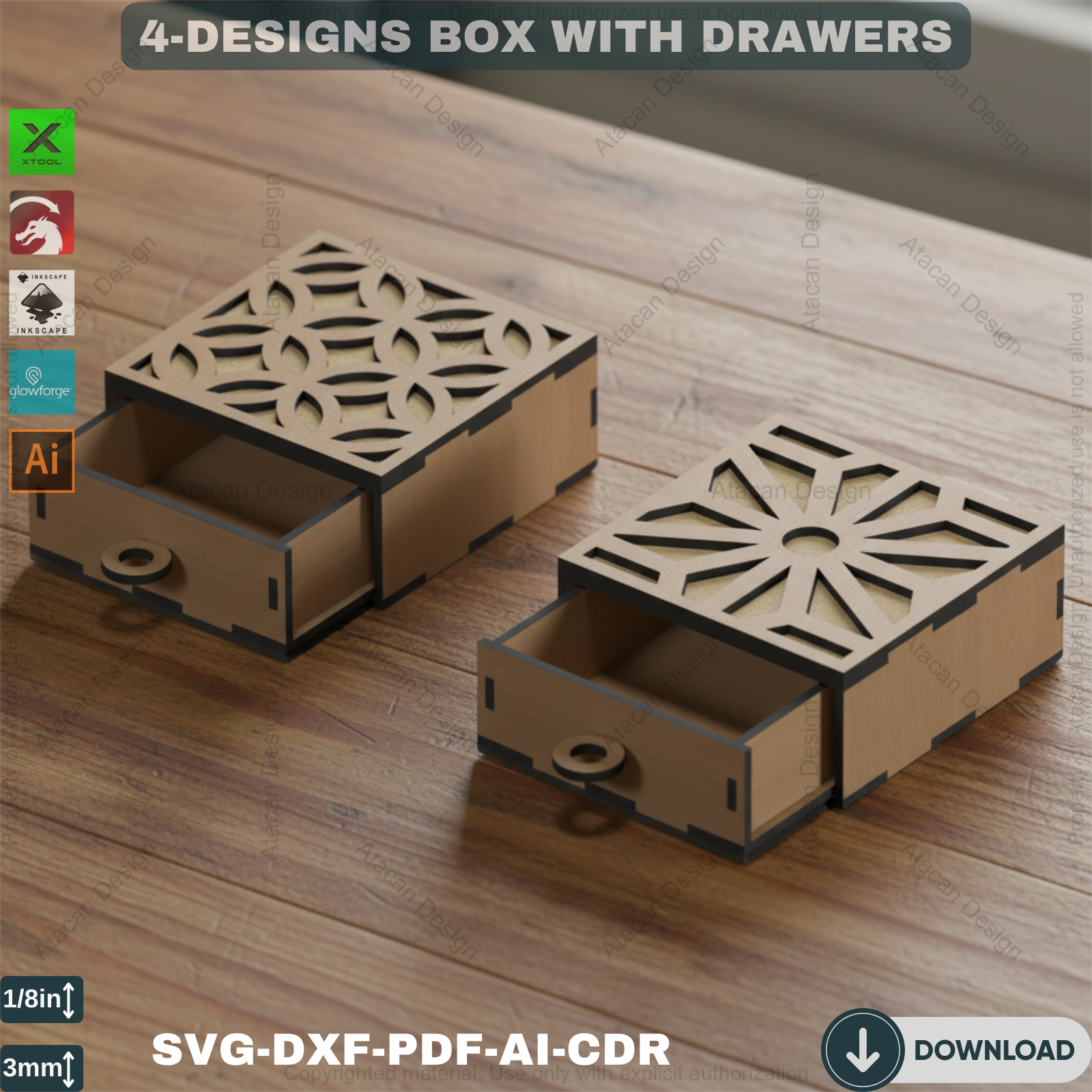Introducing our beautifully designed Box with Drawer SVG Laser Cutting Files! With its clever drawer feature, this gift box is perfect for storing small treasures, jewelry, or other valuable keepsakes. The laser cutting files ensure precise measurements, making the assembly process a breeze. Get creative and customize these wooden boxes with your own personal touch – paint them, stain them, or even engrave them with intricate designs. These DIY gift boxes make for a thoughtful and unique present, or a beautiful addition to your home decor. Crafters and woodworking enthusiasts alike will adore working with these versatile laser cutting files to bring their creative visions to life. Take your crafting to the next level and start making these exquisite Box with Drawer wooden boxes today!