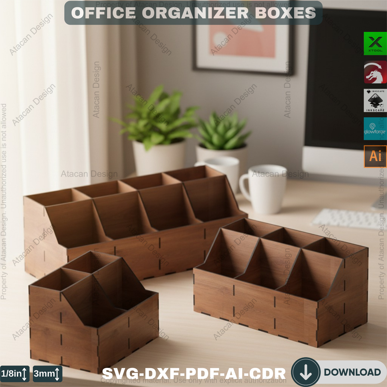 Organize your office space with our versatile Office Organizer Set, designed for laser cutting machines. This digital product includes three different sizes of divided boxes, perfect for storing letters, pencils, papers, and other office supplies. Each file is meticulously designed to ensure ease of use and compatibility with a variety of laser cutting machines and software programs.
