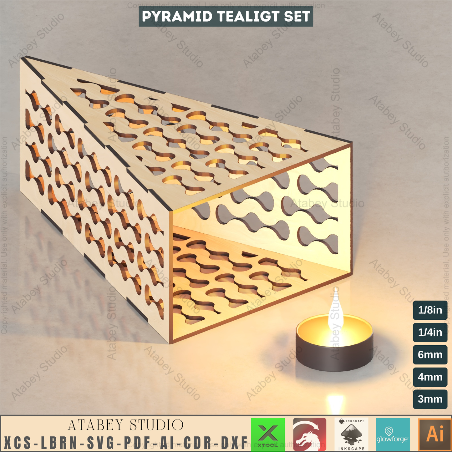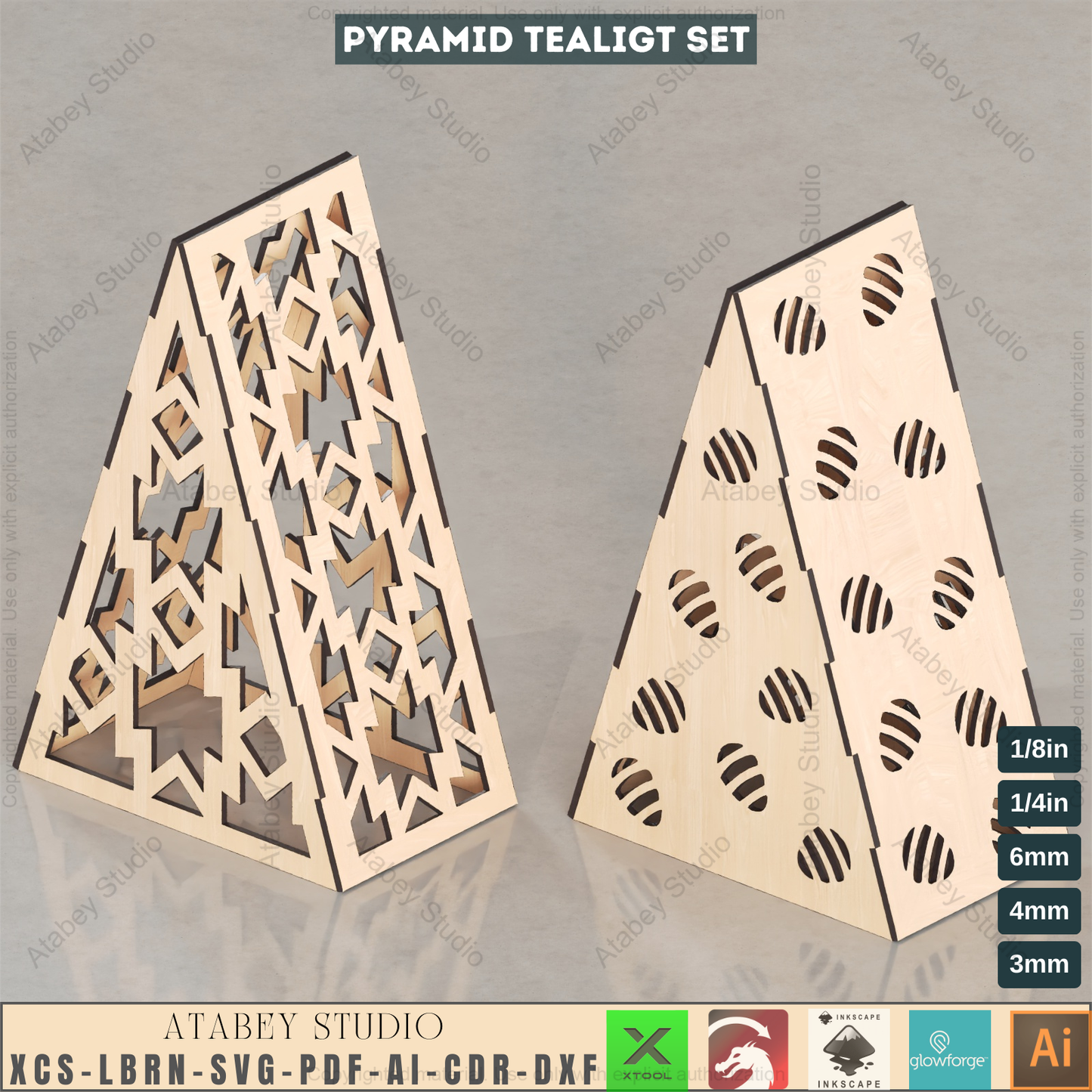 Create a captivating ambiance with this stunning set of Pyramid Tealight Holder laser cut templates! This bundle includes 6 unique and intricate designs, perfect for adding a touch of modern elegance and warm glow to any room. Ideal for use with LED tealights, these pyramids transform into beautiful luminaries, making them perfect centerpieces, accent pieces, or thoughtful handmade gifts.