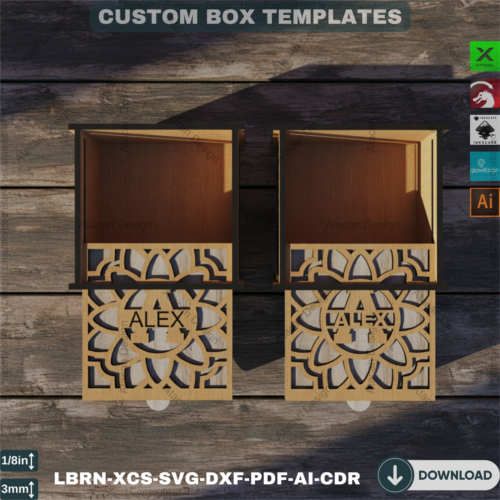 We've made customization simple and enjoyable! Our templates include a video tutorial within Adobe Illustrator and Inkscape, guiding you through the process of personalizing text to create bespoke boxes. Simply change the text to your desired personalization or message!