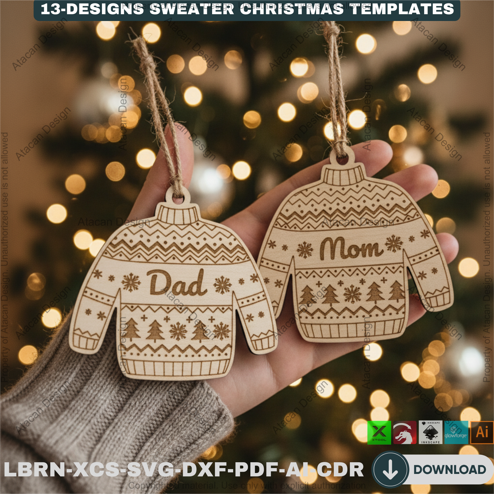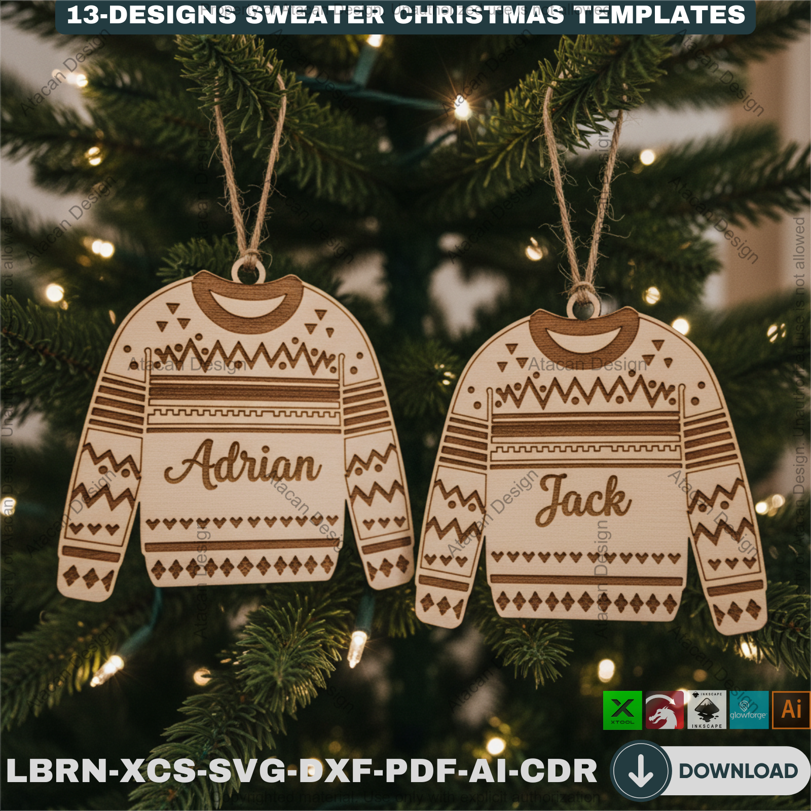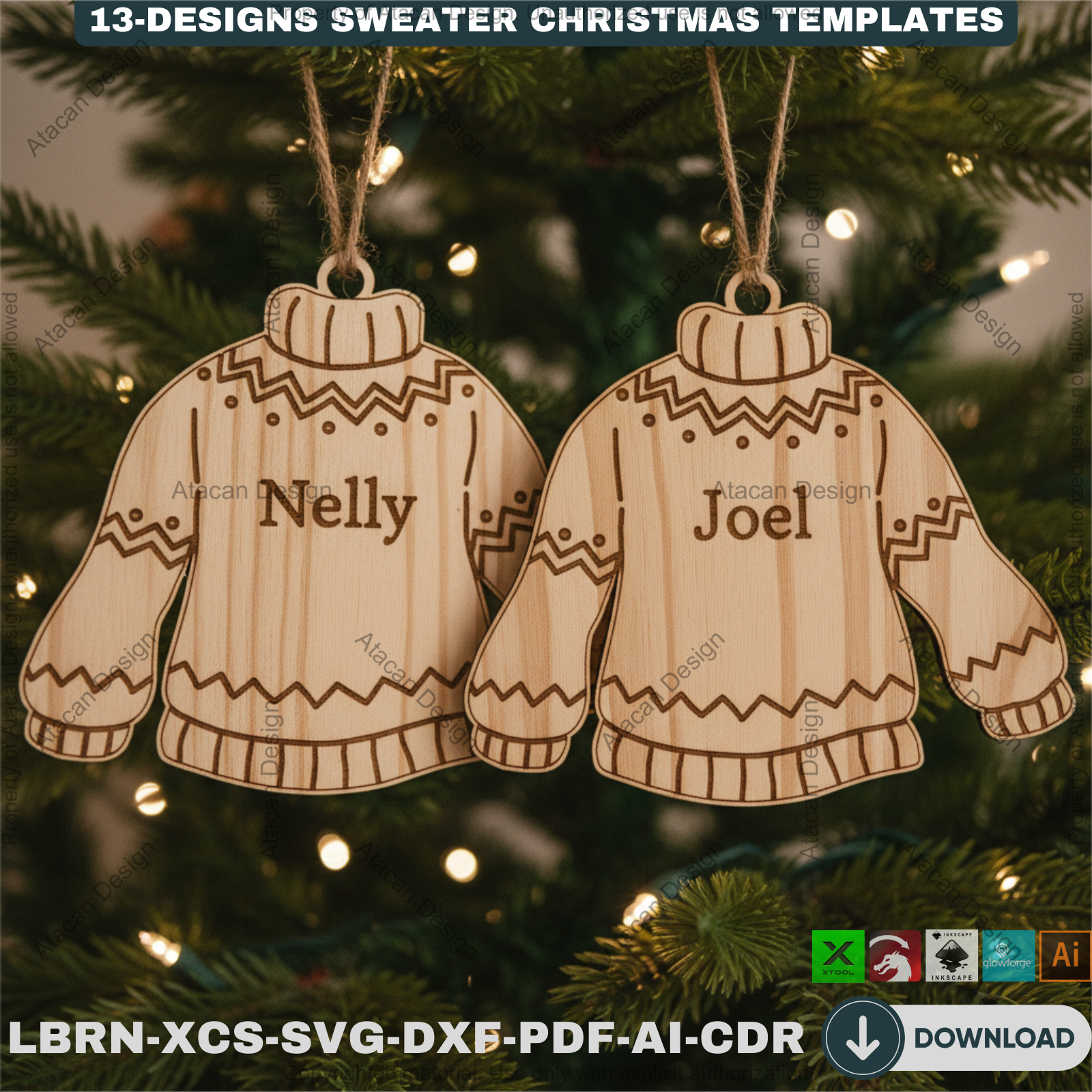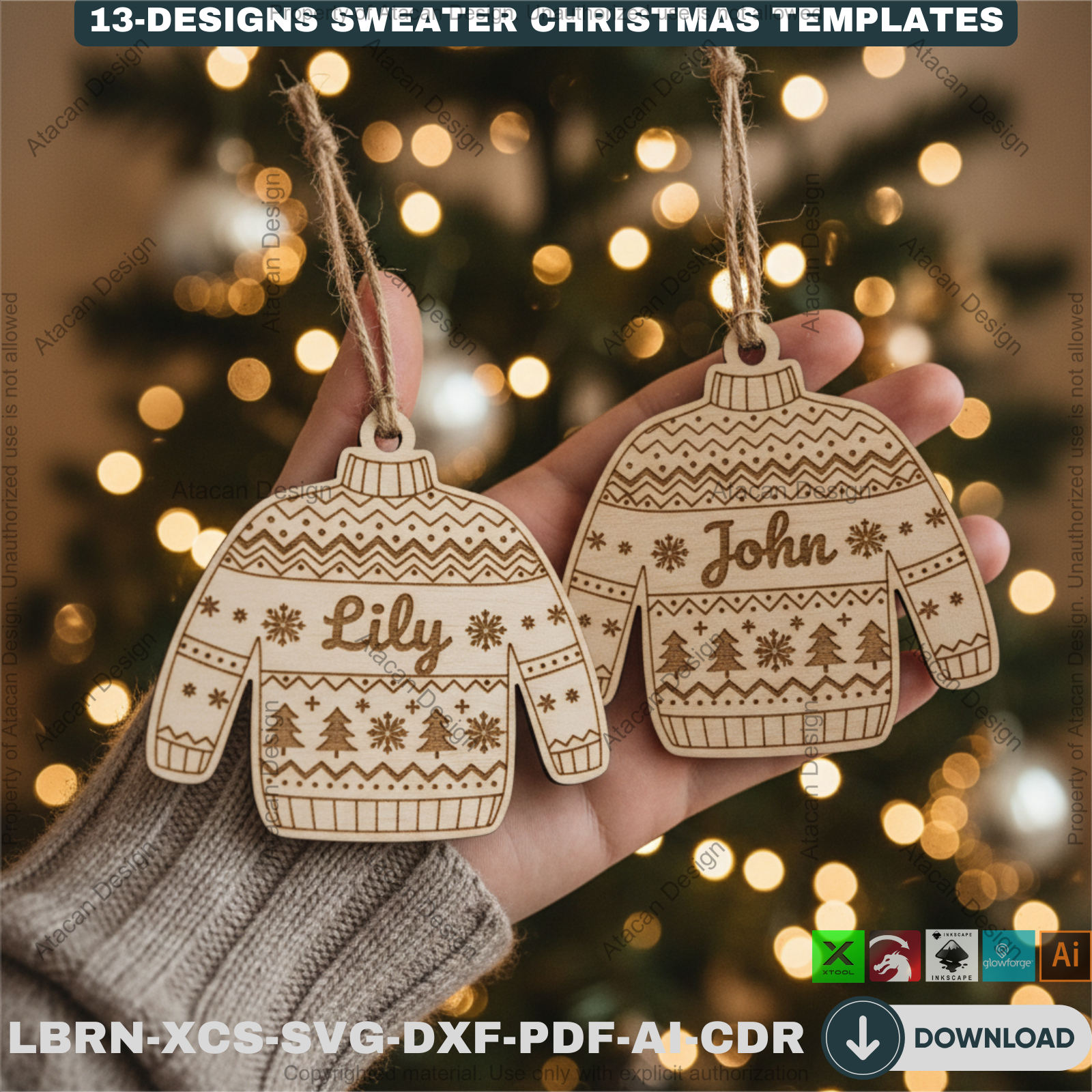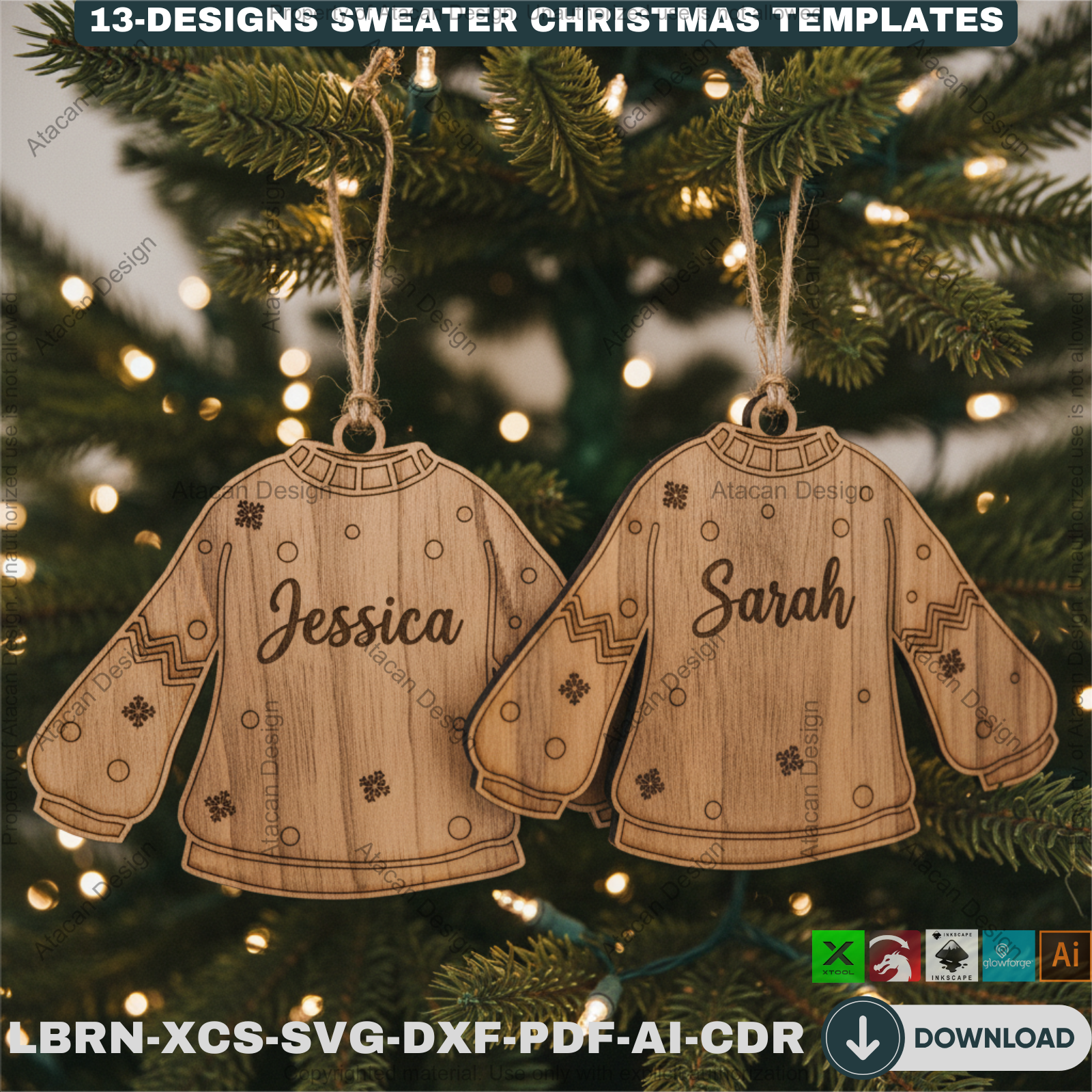 Personalized Sweater Christmas Ornament Bundle | 13 Holiday Designs | Laser Cut Template Set for DIY Xmas Gifts 918