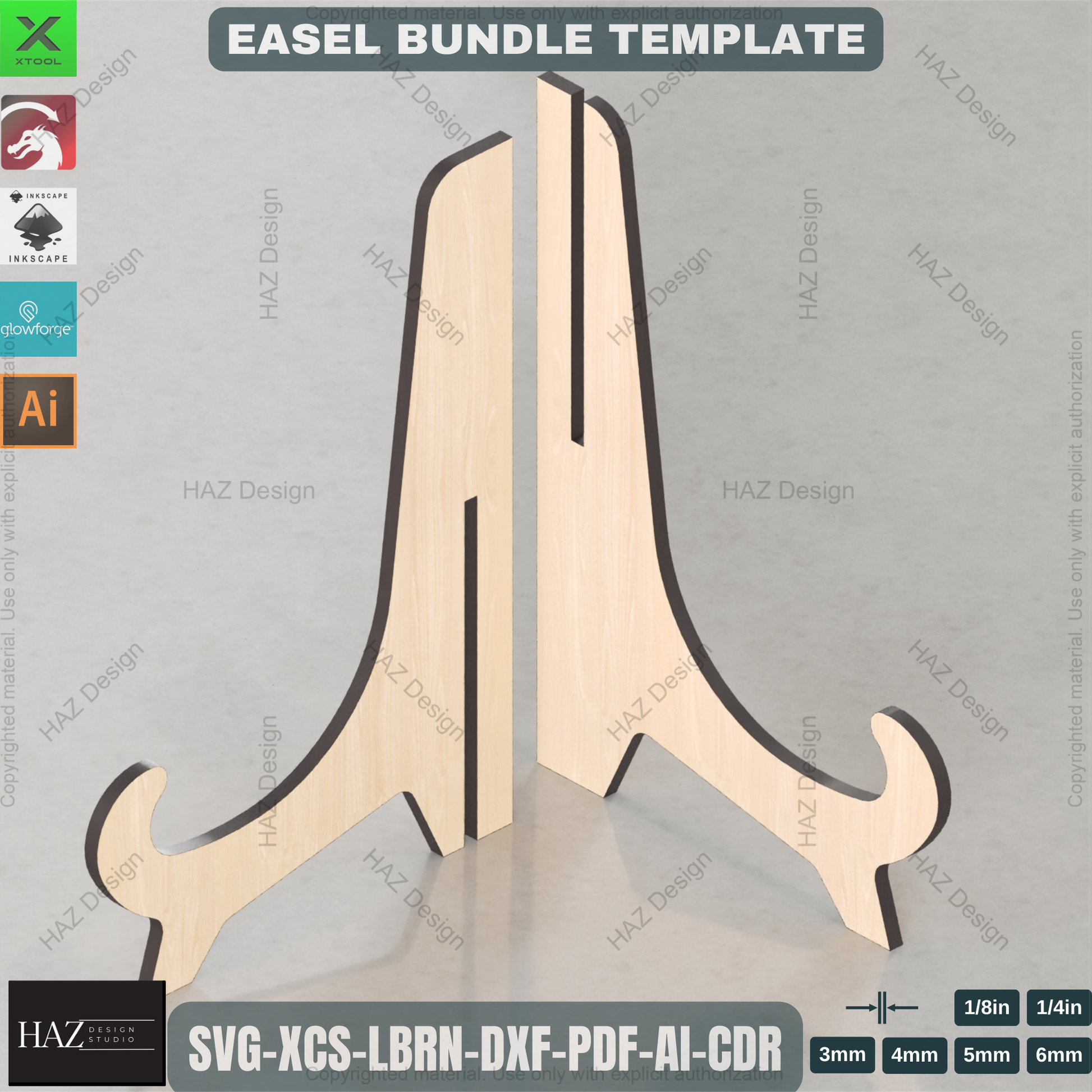 Effortlessly create beautiful and sturdy display stands with this versatile laser-cut easel bundle template! This digital download provides you with meticulously designed files to craft elegant easels in four different sizes, perfect for showcasing a wide variety of items in your home, shop, or at craft fairs.