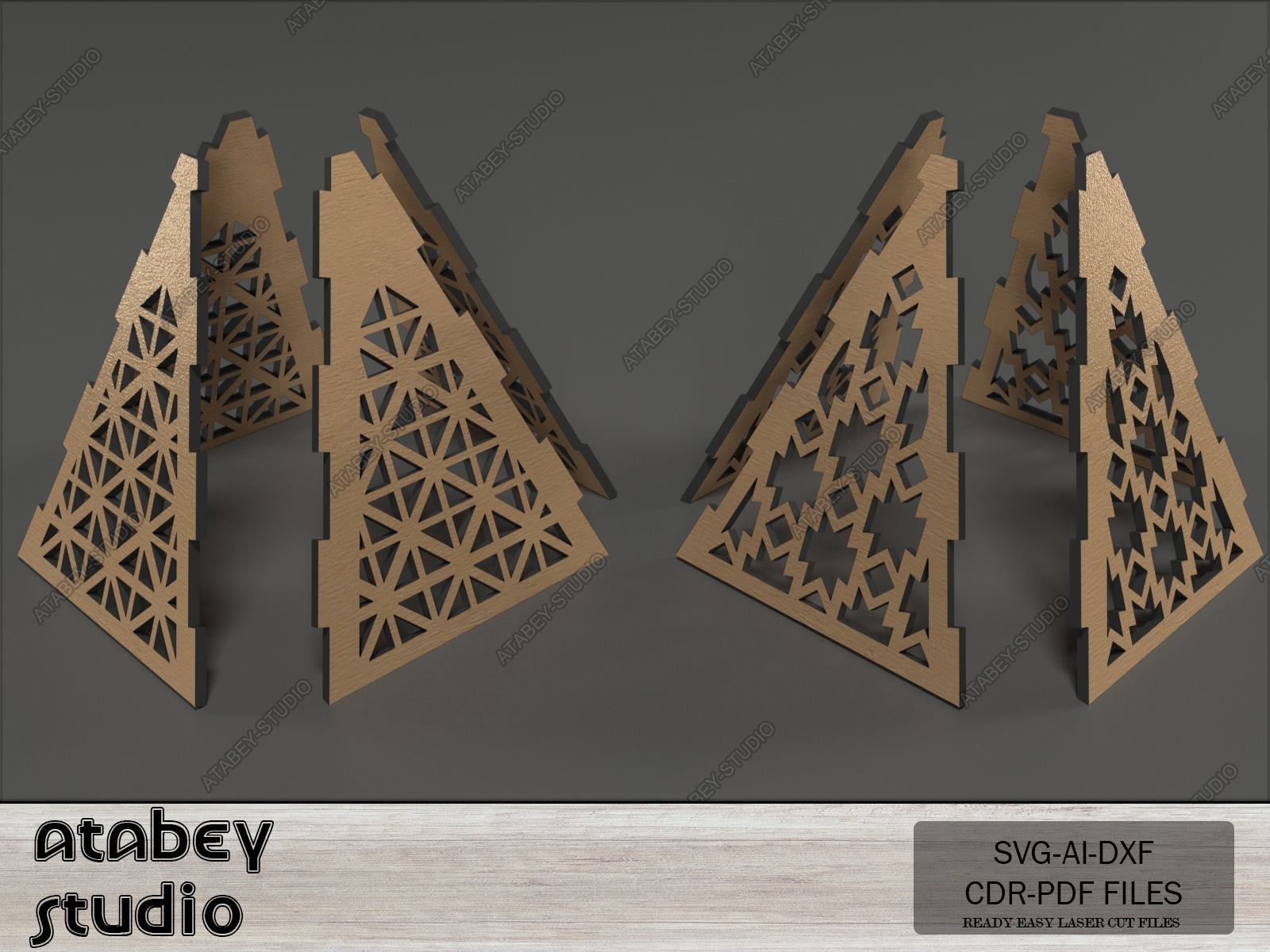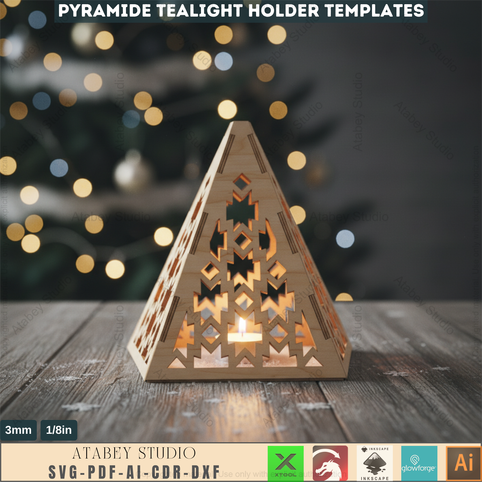 Introducing our Pyramid Candle Holder Laser Cut Files Lamp! This unique lantern is the perfect addition to any home decor. With its tea light design, it creates a warm and cozy ambiance for any occasion. Its mesmerizing laser-cut pattern casts captivating shadows that dance beautifully along your walls. This versatile piece can be displayed on a wooden table or used as a captivating centerpiece for weddings, parties, or special events. Surprise your loved ones with a gift that exudes elegance and charm - this Wooden Table Lamp Decoration will surely leave them speechless. Illuminate your space with ethereal beauty!