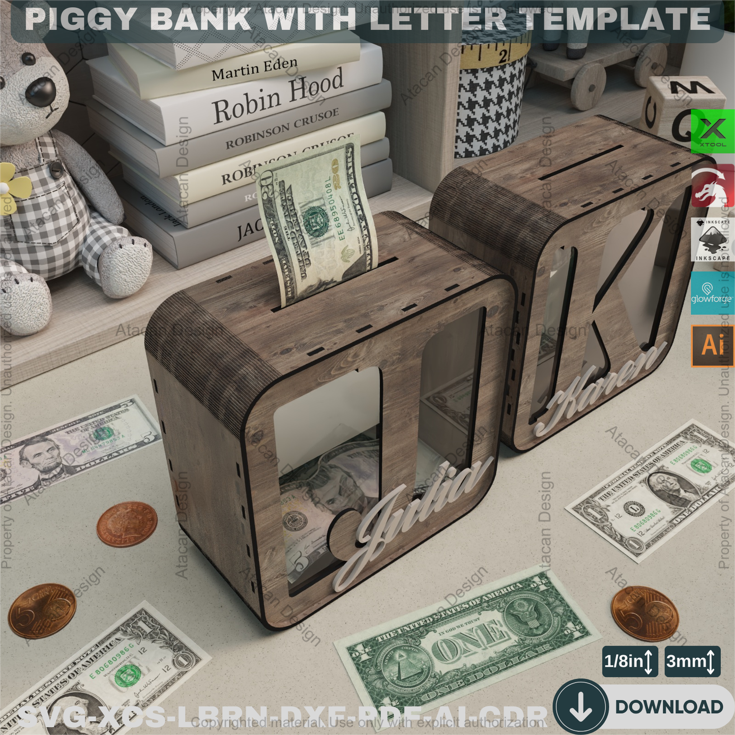 **IMPORTANT** Please note that you will not be sent ANYTHING PHYSICAL. This is a DIGITAL CUT FILE for those using a laser machine (Glowforge, Xtool, Omtech etc.). This is NOT something you will receive in the parcel. **Create a Personalized Treasure: Laser Cut Letter Piggy Bank File** Inspire a love for saving with our customizable Letter Piggy Bank Laser Cut File. This digital template allows you to create a unique and personalized piggy bank, perfect for nurseries, kids' rooms, or as a special handmade gift. **What's Included:** * **Multiple File Formats:** This download includes SVG, DXF, AI, PDF, and CDR formats for compatibility with a wide range of laser cutters and design software. * **Ready to Customize:** The template is designed for easy personalization – add a name or initial using your preferred design software. * **Versatile Compatibility:** Works seamlessly with laser cutting machines like Glowforge, Xtool, Omtech, Gweike, and more. * **Software Ready:** Compatible with LightBurn, Inkscape, Adobe Illustrator, AutoCAD, and Photoshop. **Why You'll Love This File:** * **Personalized Savings:** Create a one-of-a-kind piggy bank with a child's name, initial, or a special design. * **Thoughtful Gift:** Perfect for baby showers, birthdays, holidays, or any occasion. * **Unique Nursery Decor:** Add a touch of personalized charm to any nursery or child's room. * **DIY Fun:** Enjoy the satisfaction of creating a handmade gift with your laser cutter. **Usage and Compatibility:** This digital cut file is designed for use with laser cutting machines such as: * Glowforge * Xtool * Omtech * Gweike * And many other laser cutting machines! It is also compatible with a variety of design software including: * LightBurn * Inkscape * Adobe Illustrator * AutoCAD * Photoshop **Finished Product Sizes:** * Height: 8 inches (200mm) * Width: 8 inches (200mm) * Depth: 4 inches (100mm) **Material Compatibility:** * 1/8 inch (0.125") * 3.0 mm **Important Licensing Information:** All rights to these digital files are exclusively reserved to us. The digital files may not be resold, redistributed, or shared in any form. You are permitted to use the files to create physical products for personal or commercial use. Thank you for respecting our intellectual property! **Please Note:** Due to the digital nature of this product, refunds and exchanges are not offered. Every effort has been made to ensure the files are free from defects under normal usage conditions. Download your Laser Cut Letter Piggy Bank File today and start creating a memorable keepsake!