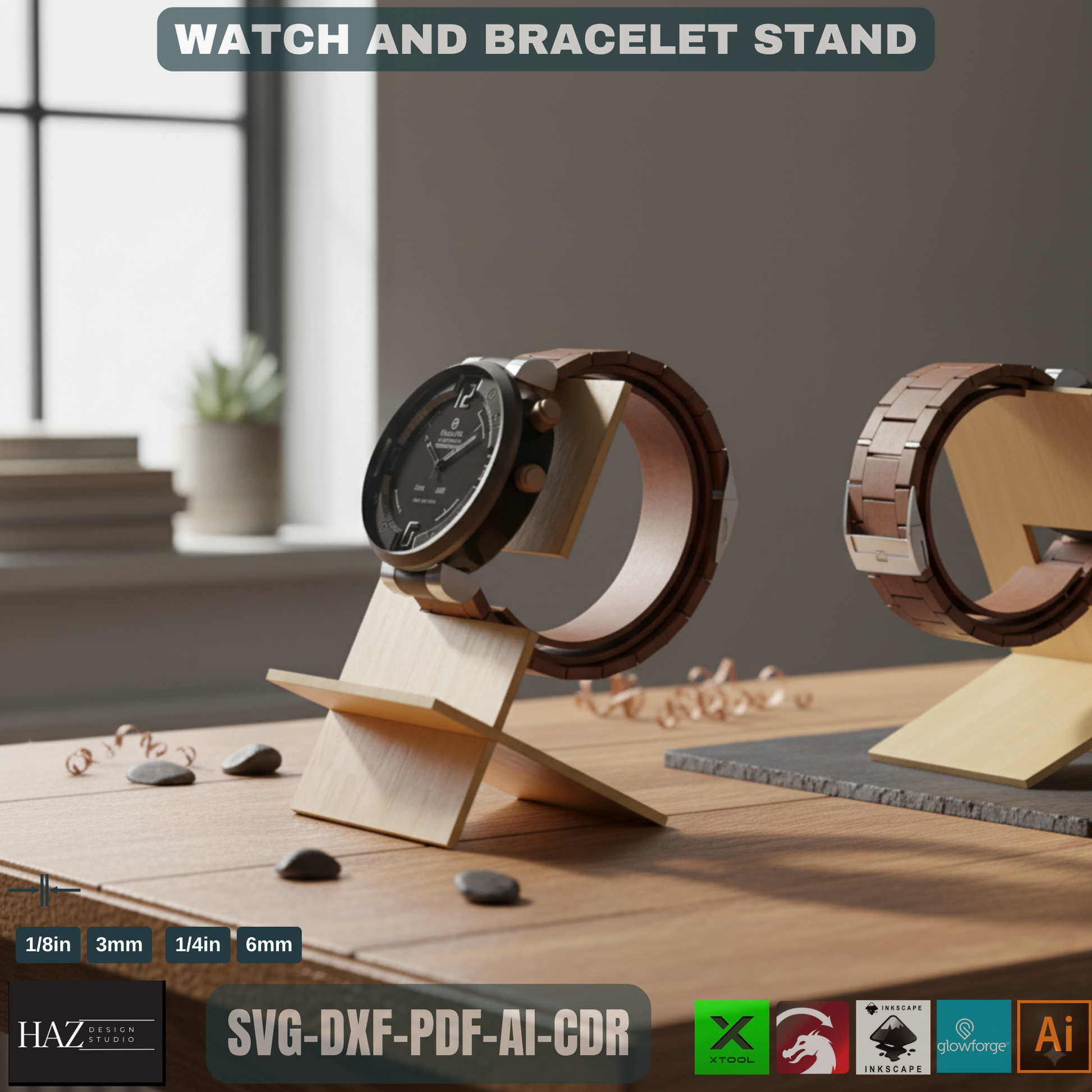 Elevate your watch collection with our stylish and functional laser-cut watch and bracelet stand! 🕰️✨ This digital download offers everything you need to create a beautiful display for your favorite timepieces and accessories. Crafted with a modern, minimalist design, it's perfect for your dresser, nightstand, or retail display.